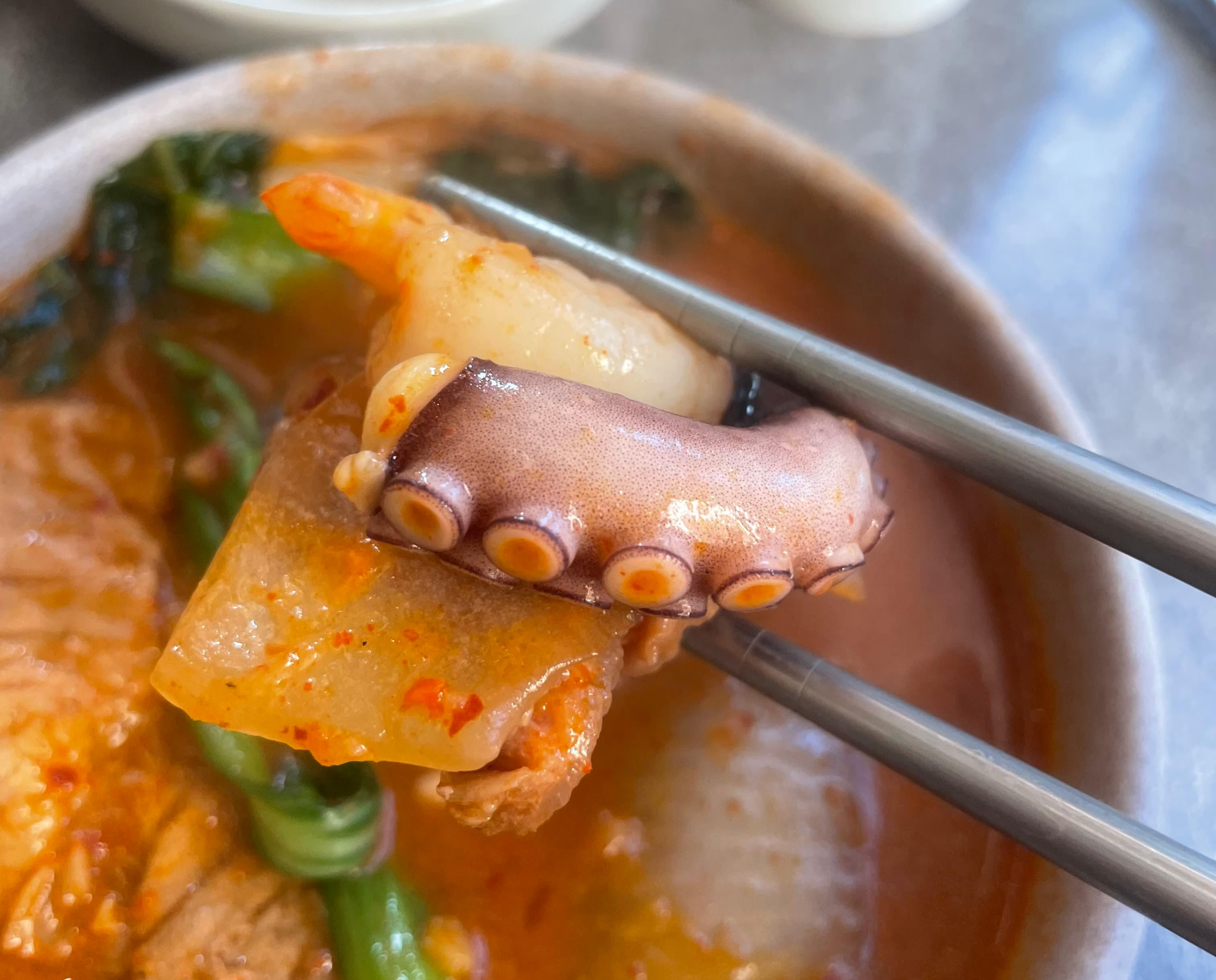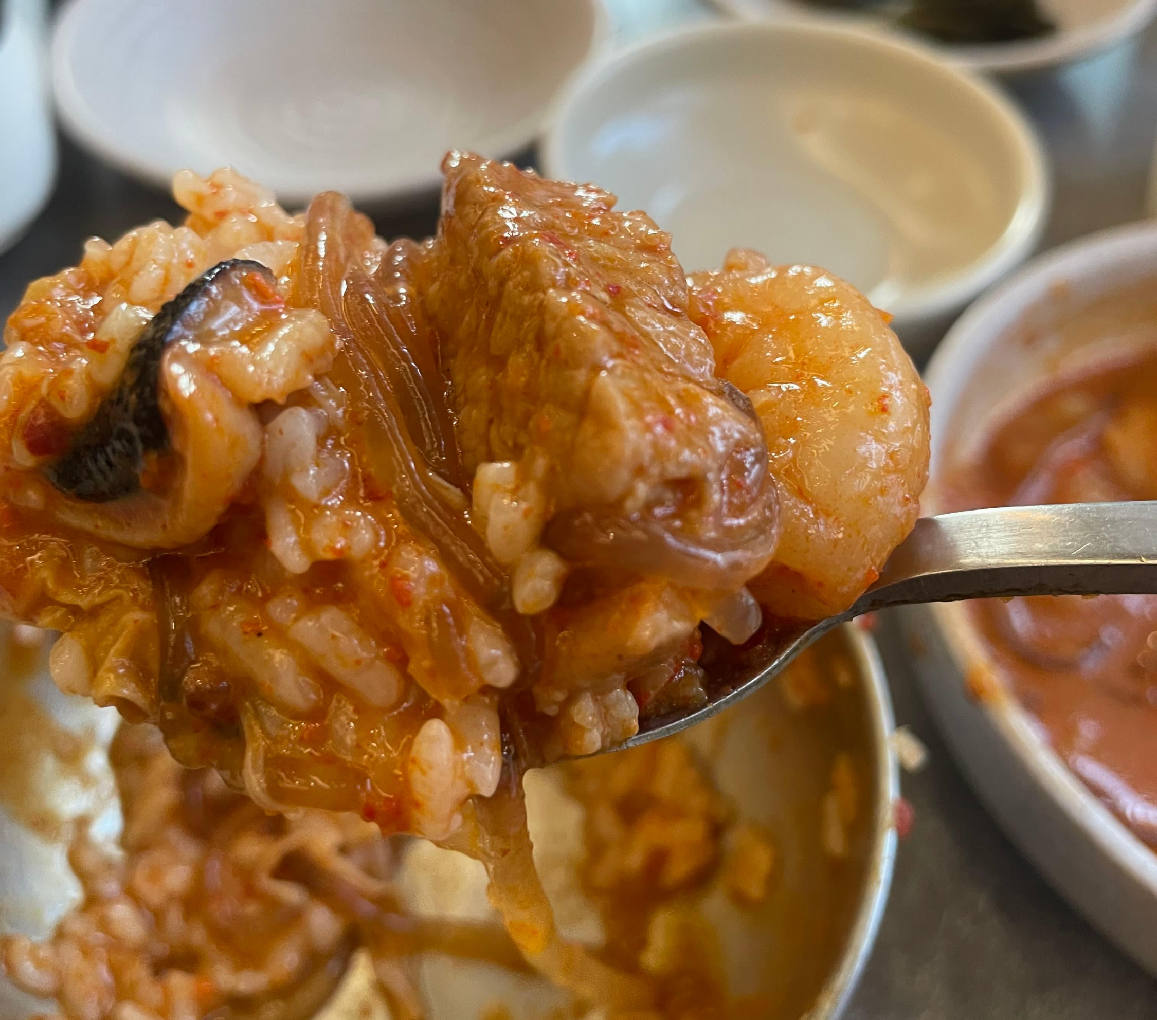 갈비와 양파, 낙지, 새우를 집어주고 한 입 먹었습니다. 매콤하면서 고기도 부드럽고 입 안에 새우와 낙지가 같이 어우러져 정말 맛있었습니다.