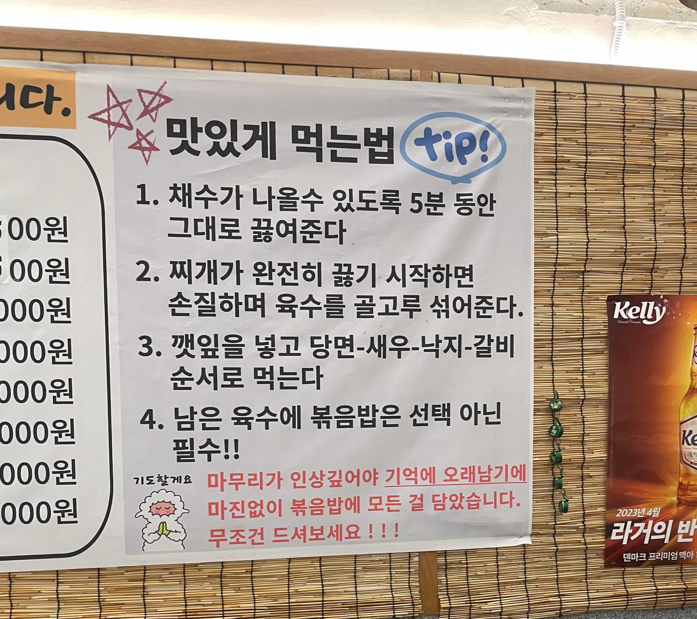 일단 들어와서 황제 갈비찌개(낙갈새) 2인 중간(보통)맛과 공기밥 2개를 주문했습니다. 그리고나서 벽면에 붙어 있는 맛있게 먹는법 팁을 읽어주시면 됩니다.